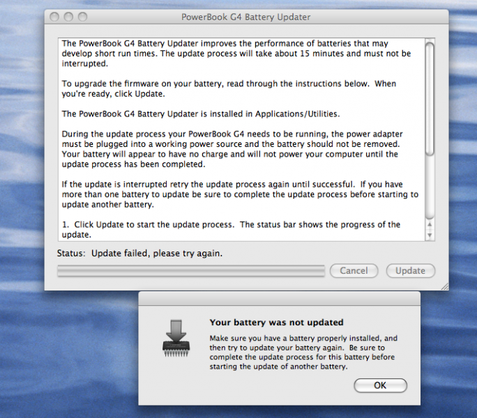 Zkusil jsem Powerbook G4 Updater, ale píše mi, že nemám baterii nainstalovanou, zde je screenshot